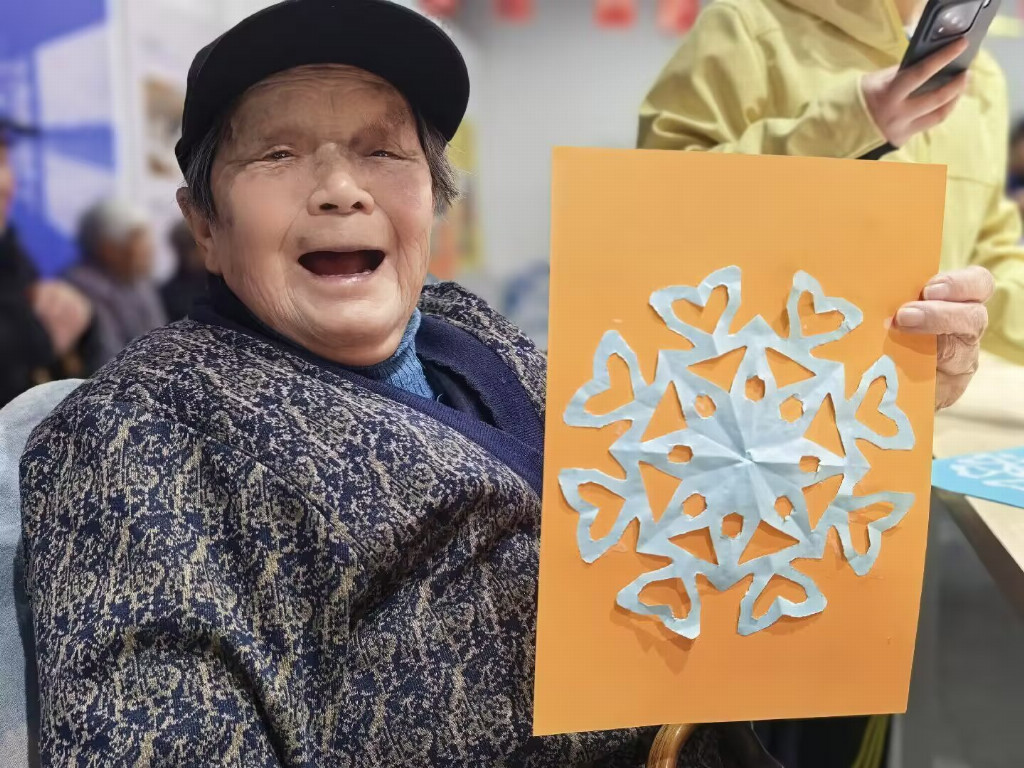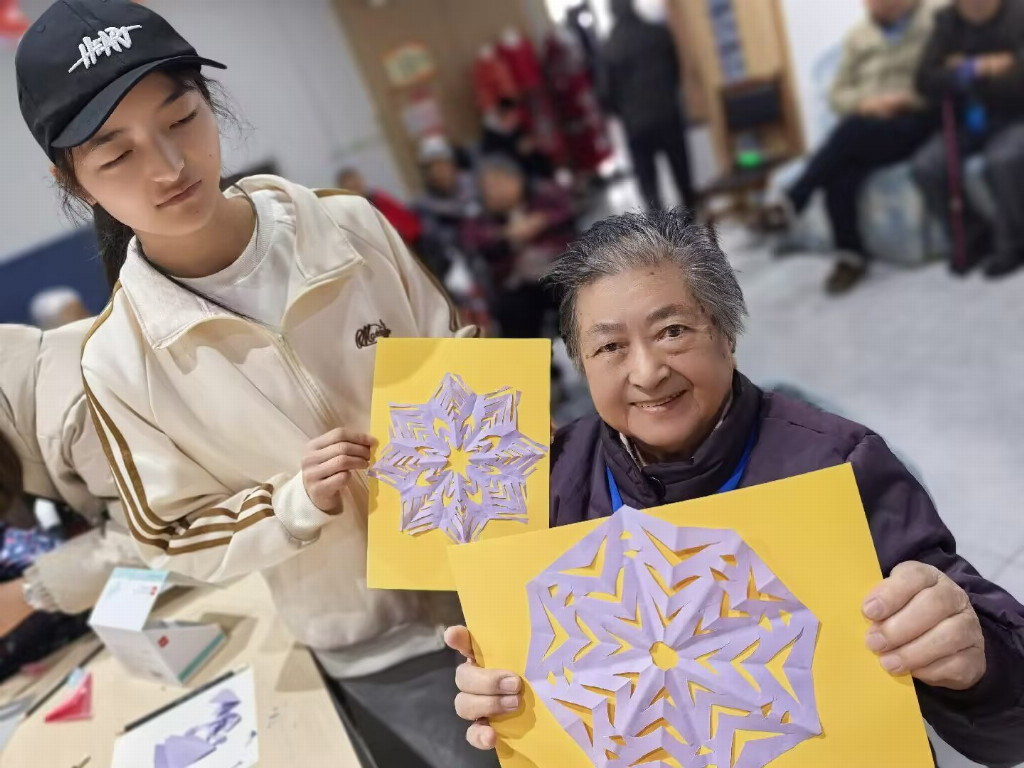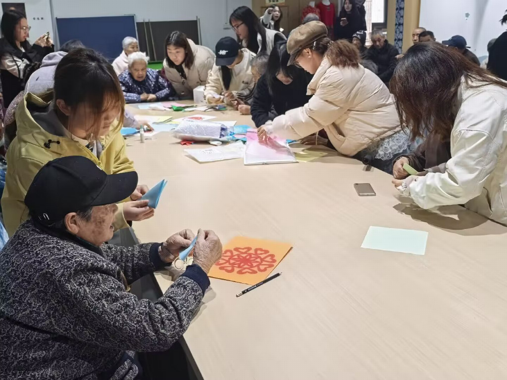 除了精彩纷呈的文艺表演,志愿者们还为老人们准备了趣味十足的剪纸手工体验活动。志愿者们提前准备好卡纸、剪刀、胶水等工具,围坐在老人们身边,手把手耐心指导大家折纸、构图、裁剪。从简单的直线、弧线裁剪,到精巧的窗花、福字、爱心等图案制作,志愿者们一步步细致讲解、悉心辅助。老人们兴致勃勃地动手尝试,一张张鲜艳的纸片在指尖翻转、剪裁,不一会儿就变成了一幅幅精致可爱的剪纸作品。看着自己亲手完成的作品,老人们显示出了自豪、满足与开心的姿态,大家互相展示、互相夸赞,现场其乐融融,暖意浓浓,在指尖互动中传承了传统民俗文化,也拉近了彼此的距离。