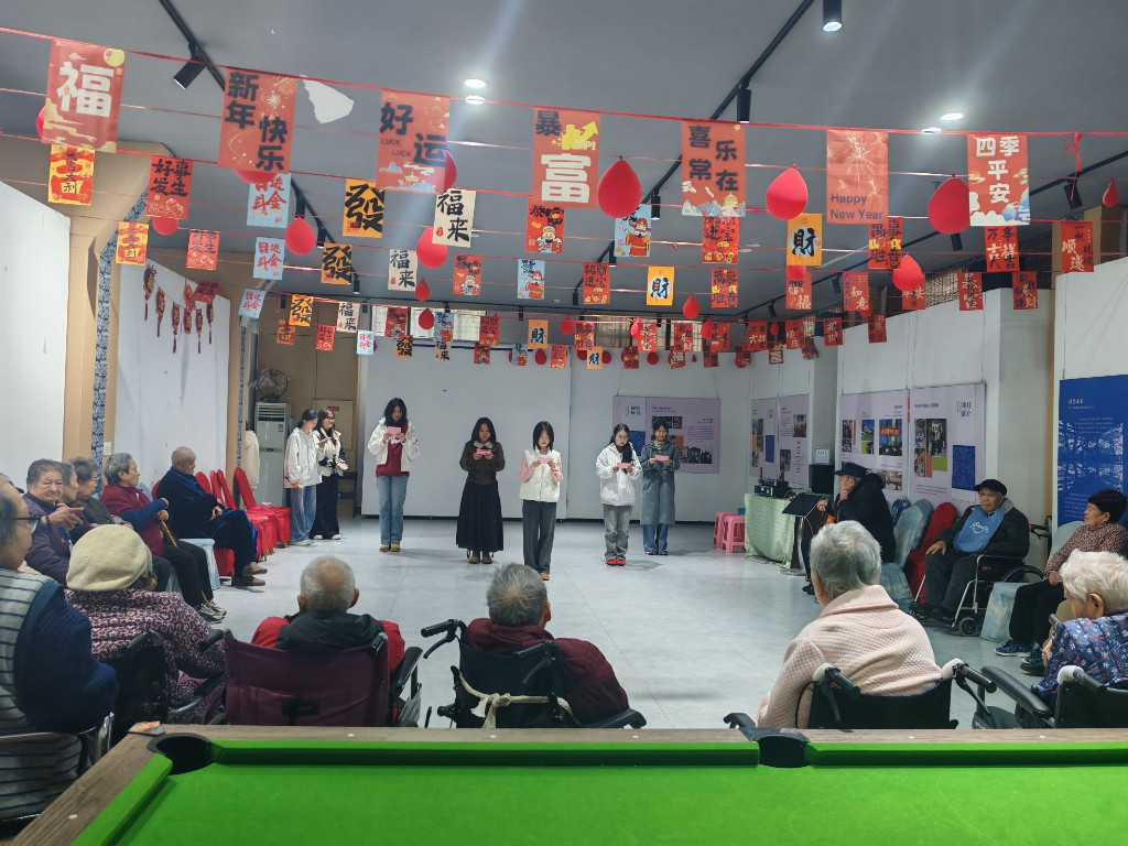 活动伊始,志愿者们为老人们献上了精心编排的诗歌朗诵《夕阳与春风》。朗诵者们身着整齐服装,语调舒缓轻柔、情感真挚饱满,一字一句饱含着对老人们的深切敬意与美好祝福,将春日暖阳的温柔与敬老爱老的心意娓娓道来。深情的朗诵声在敬老院的大厅中久久回荡,质朴而温暖的文字触动了老人们内心最柔软的角落,在场的老人们纷纷静静聆听,有的微微颔首,有的眼中泛起温情的泪光,脸上都洋溢着欣慰与感动的笑容,现场氛围温馨而治愈,处处流淌着浓浓的温情。
